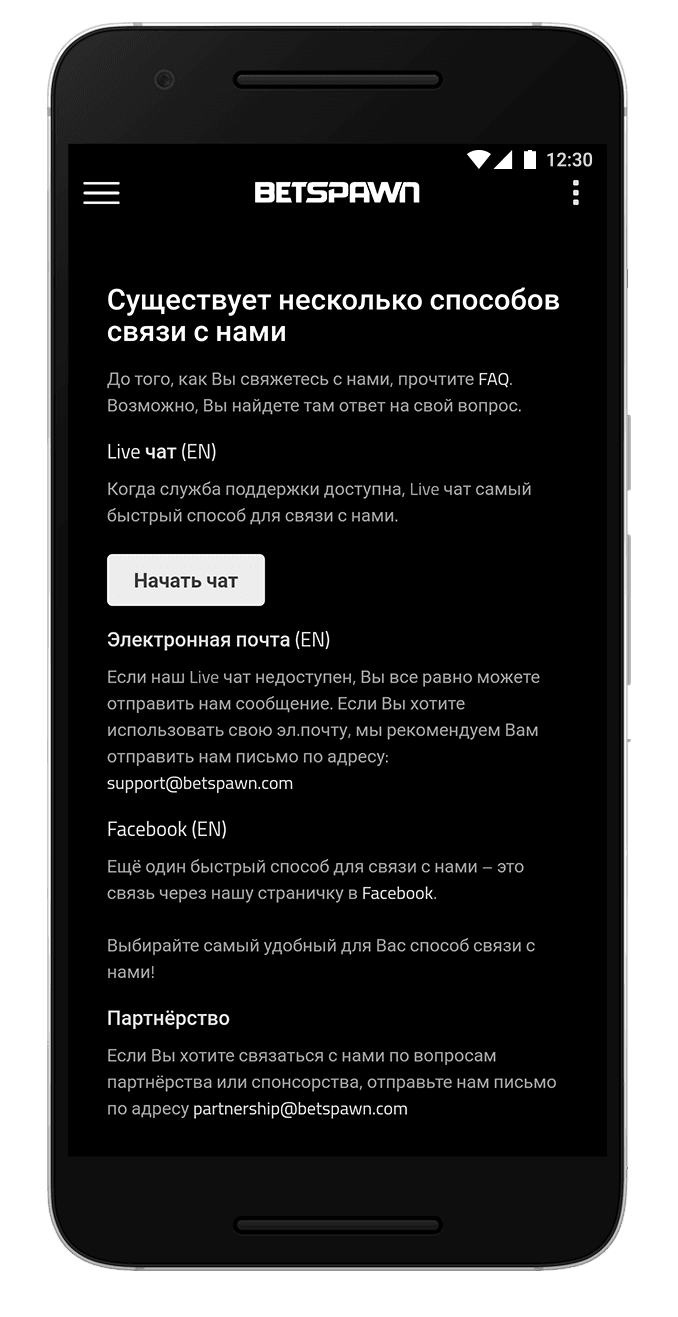 Вы можете связаться с агентами поддержки клиентов несколькими способами. Посылка электронного письма является одним из них, но это еще не все. Betspawn, как очень социально ориентированная букмекерская контора, также имеет канал в Facebook, который они открывают для запросов клиентов. Если вы не фанат социальных сетей, вы всегда можете открыть функцию живого чата. Как только вы войдете в свою учетную запись и отправите сообщение, через несколько минут появится окно чата в реальном времени с агентом по обслуживанию клиентов, который будет ждать ваших запросов.