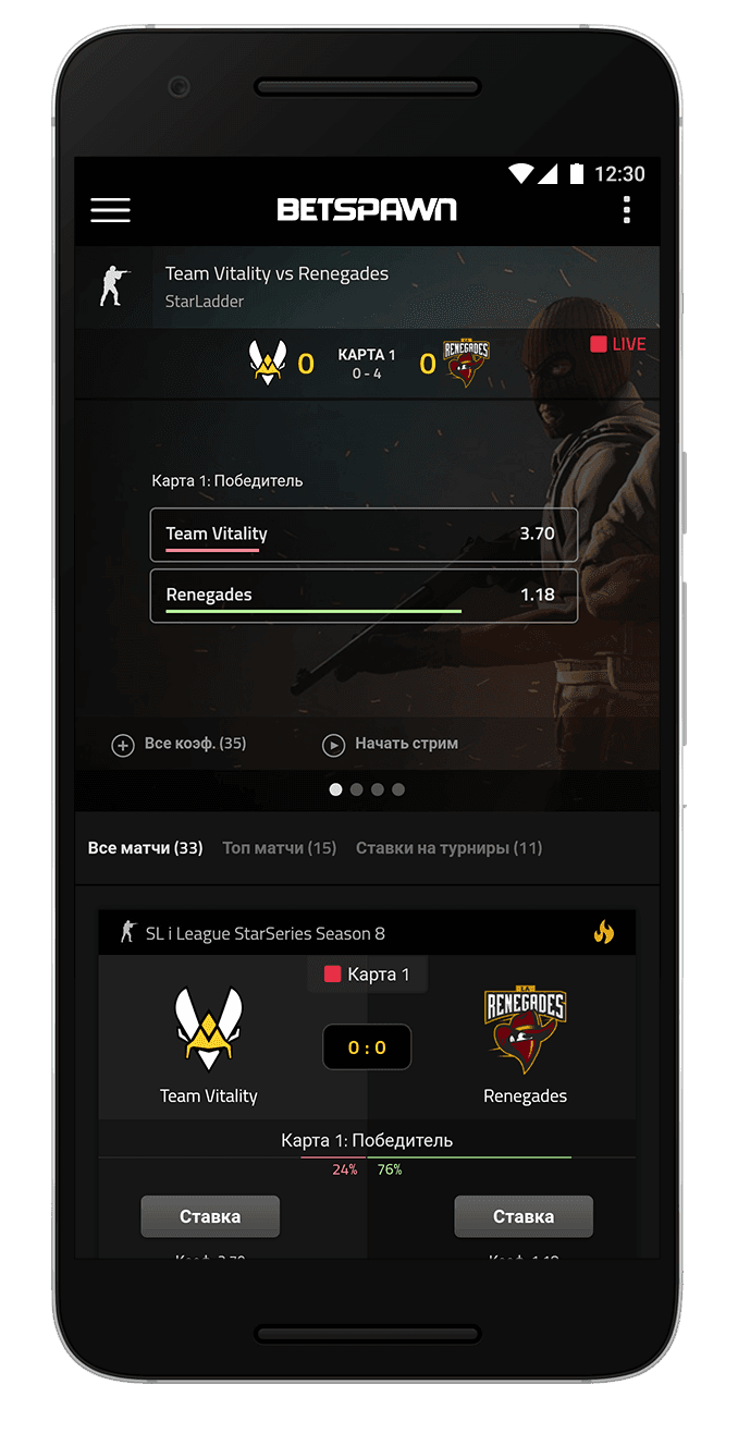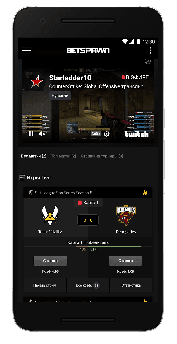 Прямая трансляция предоставлена известным мировым брендом Twitch, а качество отснятого материала не имеет аналогов. Интересной функцией видеотрансляции, предоставляемой Betspawn, является мультиокно. Вы можете иметь до 5 отдельных активных потоков, просматривая все выбранные вами события одновременно! Имейте в виду, что вам нужно будет отключить звук у окон - вам, наверно, не захочется слушать несколько живых комментариев к событиям одновременно.
