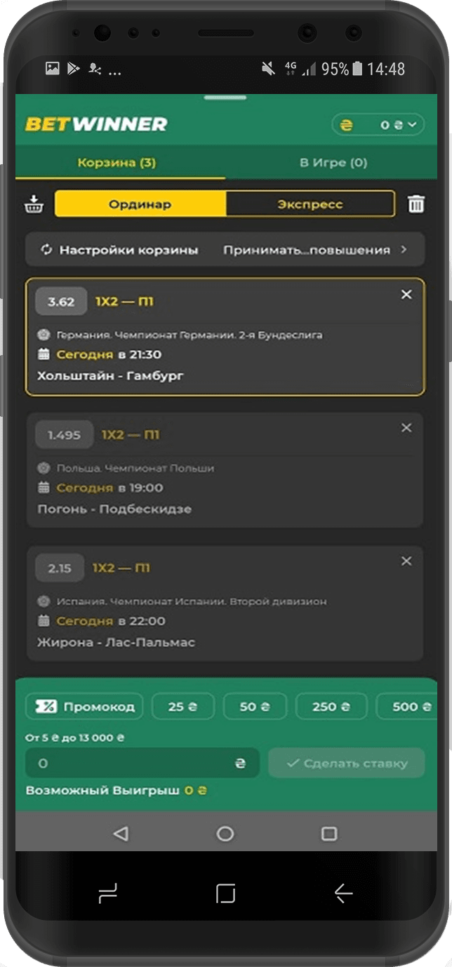 Чтобы сделать ставку, откройте мобильное приложение Betwinner. Зайдите в личный кабинет, указав логин и пароль. При необходимости пополните счет одним из доступных методов оплаты.