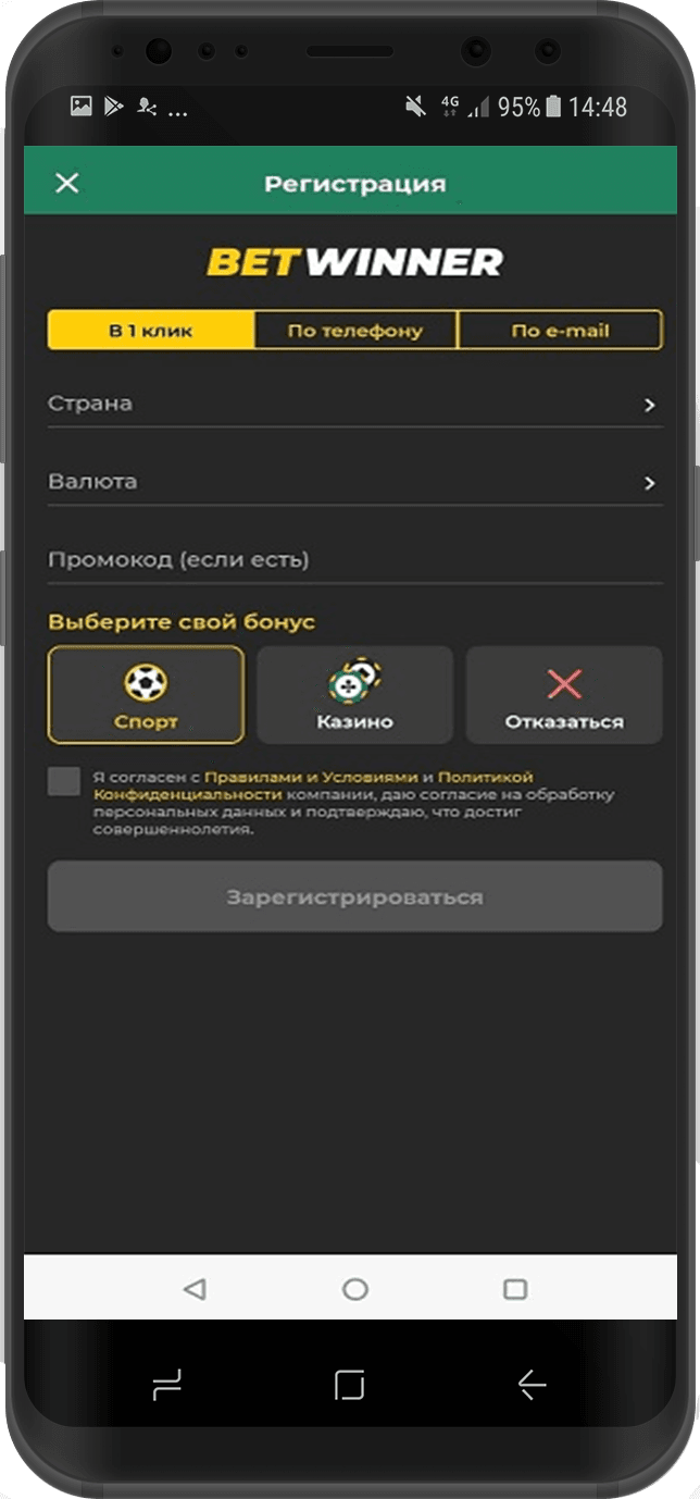 Чтобы создать учетную запись, откройте приложение Betwinner на Android и нажмите кнопку «Регистрация», читайте подробнее как пройти регистрацию. На экране появится форма, в которой нужно выбрать один из трех вариантов: