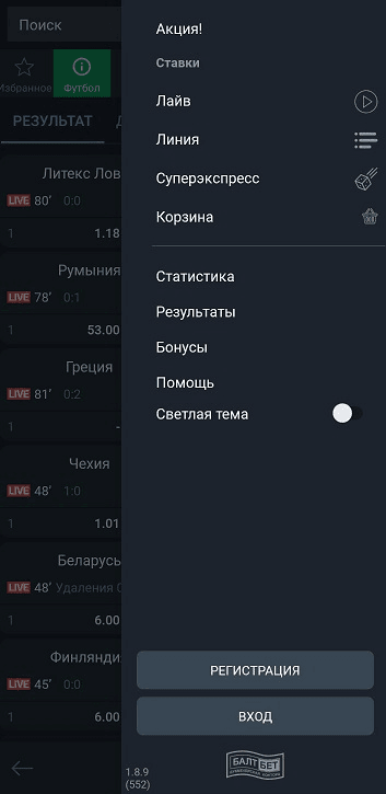 Нативная программа оператора для Андроид получила достаточный набор как основных, так и дополнительных функций. Зарегистрированные и идентифицированные пользователи могут делать ставки в прематче и лайве, а также принимать участие в суперэкспрессе, который является аналогом тотализатора. В качестве основной темы выбран темный фон с применением синих и серых тонов. При желании можно воспользоваться переключателем на светлую тему.