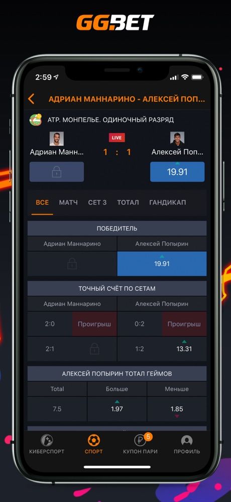 Чтобы разместить ставку лайв или прематч в мобильном приложении ГГБЕТ для iOS, нужно тапнуть по коэффициенту исхода, который автоматически отправиться в купон. Корзина программы выглядит стандартным образом. В ней нужно выбрать тип ставки, указать сумму и согласиться или не согласиться с условиями, если коэффициент изменился. К слову, в программе есть инструменты для настройки политик заключения пари на случай роста или падения котировок.