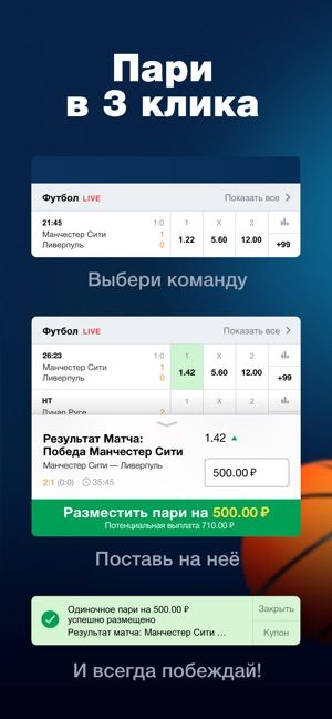 Приложение предлагает функцию "Ставка в один клик" для более быстрого размещения пари. Чтобы активировать ее, перейдите в настройки приложения. Обратите внимание, что минимальная сумма ставки составляет 10 рублей. Максимальная сумма зависит от конкретного события и рынка. После размещения ставки вы можете отслеживать ее статус в разделе "Мои ставки". Там же доступна функция Cash Out для некоторых пари, позволяющая рассчитать ставку досрочно.