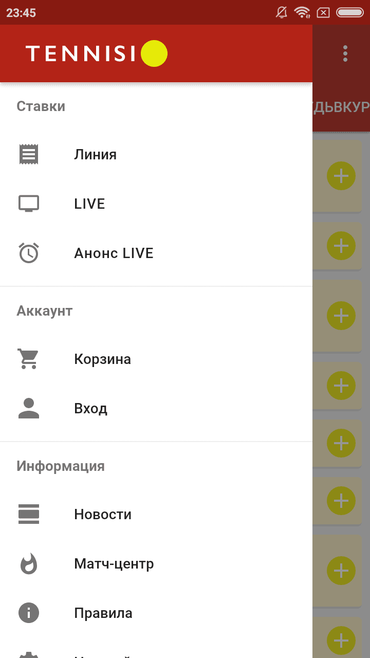В приложении «Тенниси» доступно боковое меню, где представлены основные разделы букмекера: линия, Live, анонс Live, корзина, бонусы, новости, настройки, правила, вопросы и ответы, онлайн-чат службы поддержки (для зарегистрированных пользователей).