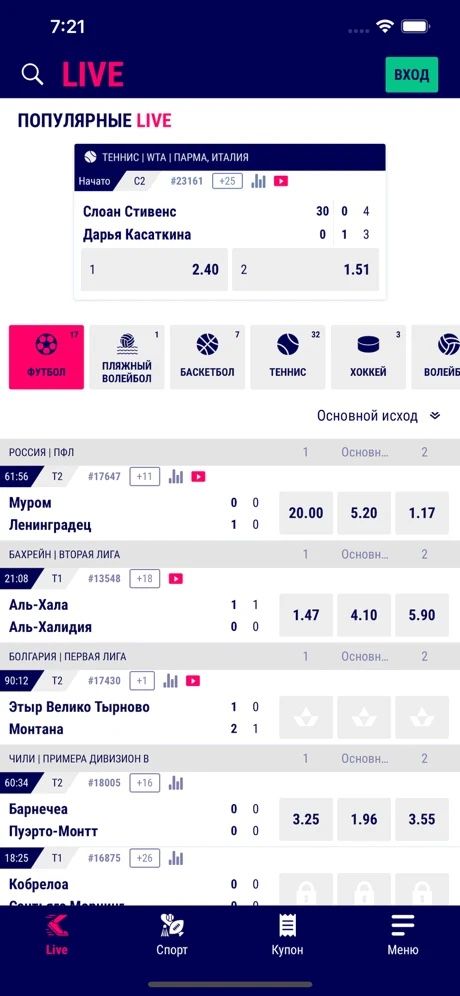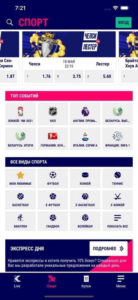 Программа БК для iPhone и iPad дает возможность комфортно размещать ставки на спорт. В ней есть два режима для заключения пари – до начала событий «Спорт» и по ходу их проведения «Live».