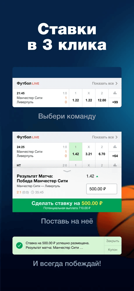 Чтобы разместить экспресс-ставку, отправьте в купон два или больше исходов. Затем в билете нажмите «экспресс», укажите сумму и заключите пари.