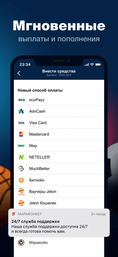 В приложении БК Марафон Бет для Айфон можно вводить и выводить деньги на пластиковые карты, электронные кошельки, онлайн-системы и криптовалюты.