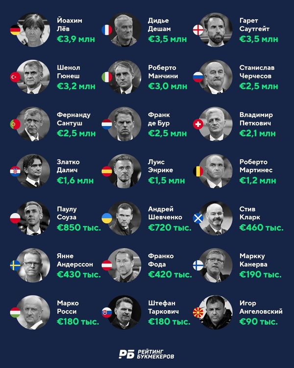 Черчесов – шестой среди тренеров Евро-2020 по уровню зарплат, Шевченко – 14-й. Рейтинг зарплат на евро