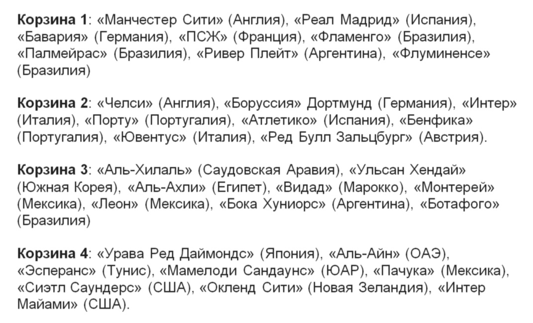 Определены все 4 корзины для жеребьевки клубного чемпионата мира. Соревнования в 2025 году пройдут в новом формате. В них примут участие 32 команды. На групповом этапе их разделят на 8 групп, причем команды из одной страны не смогут встретиться в группе.