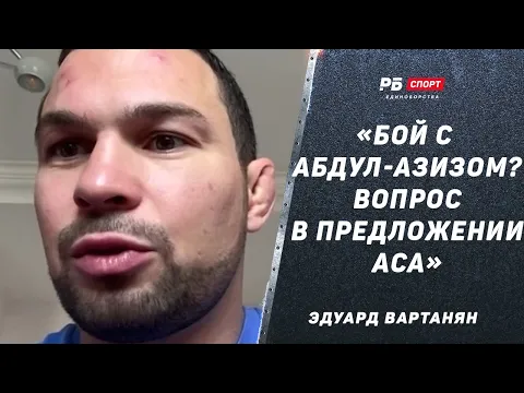 Боец ММА Эдуард Вартанян в интервью «РБ Спорт» рассказал, что его впечатлила победа Абдул-Азиза Абдулвахабова над Али Баговым в финале Гран-при АСА, и назвал условия, на которых примет поединок с Азизом. Также Вартанян рассказал, как идет подготовка к бою с Марифом Пираевым, который состоится на Fight Nights 16 августа.