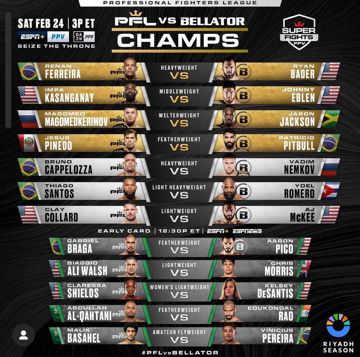 Кард совместного турнира PFL и Bellator представлен ниже.