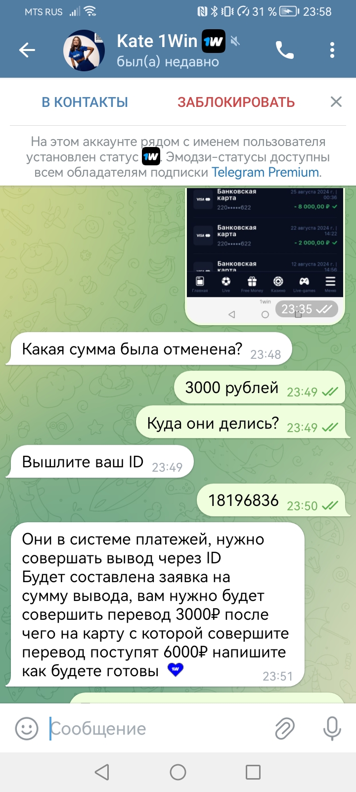 Здравствуйте выводил деньги с 1win в выводе написано что деньги зачислены но деньги на карту так и не пришли обращался в поддержку пишут ждать 7…