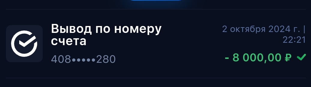 Здравствуйте сделал вывод на 8000 рублей на счёт карты, вывод пишет, что, успешно завершён, но деньги так и не поступили на счёт!!!! Решите проблему!!!! Пожалуйста!!!!