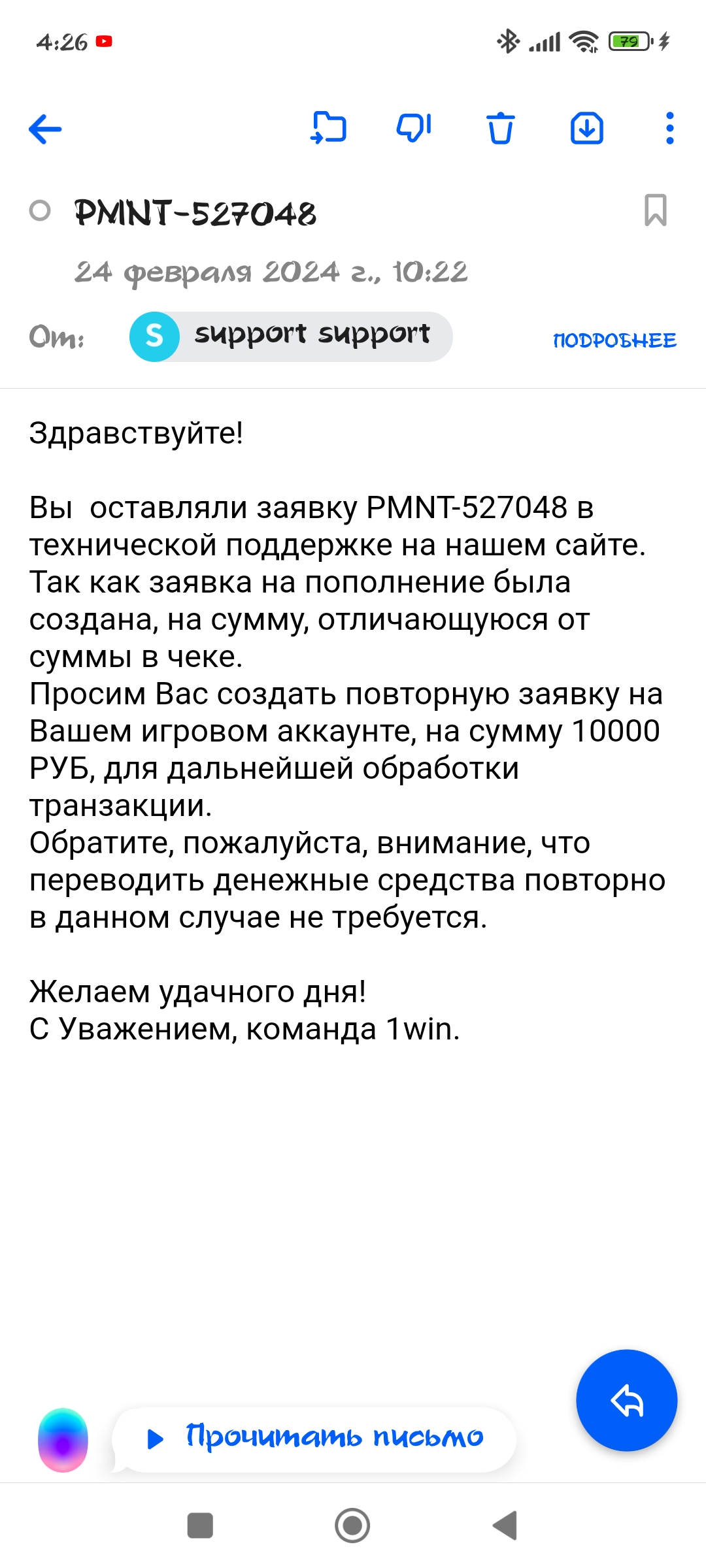 Мне прислали на почту, что бы я совершил запрос на пополнение. Ответил вам скриншотами что данные действия выполнил и обратился в ТГ к Кате. С таким же ответом. Надеюсь вы не будете тянуть я зачислением.