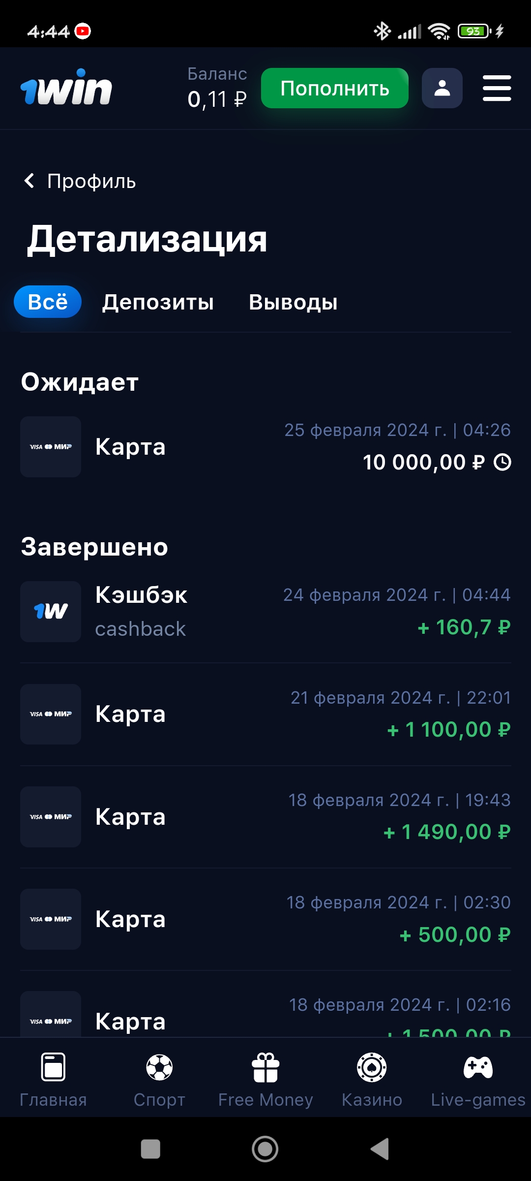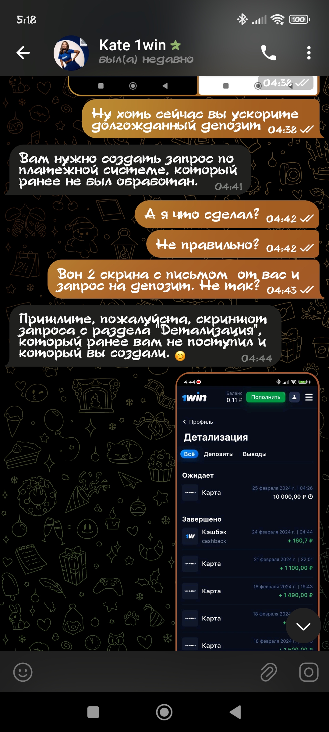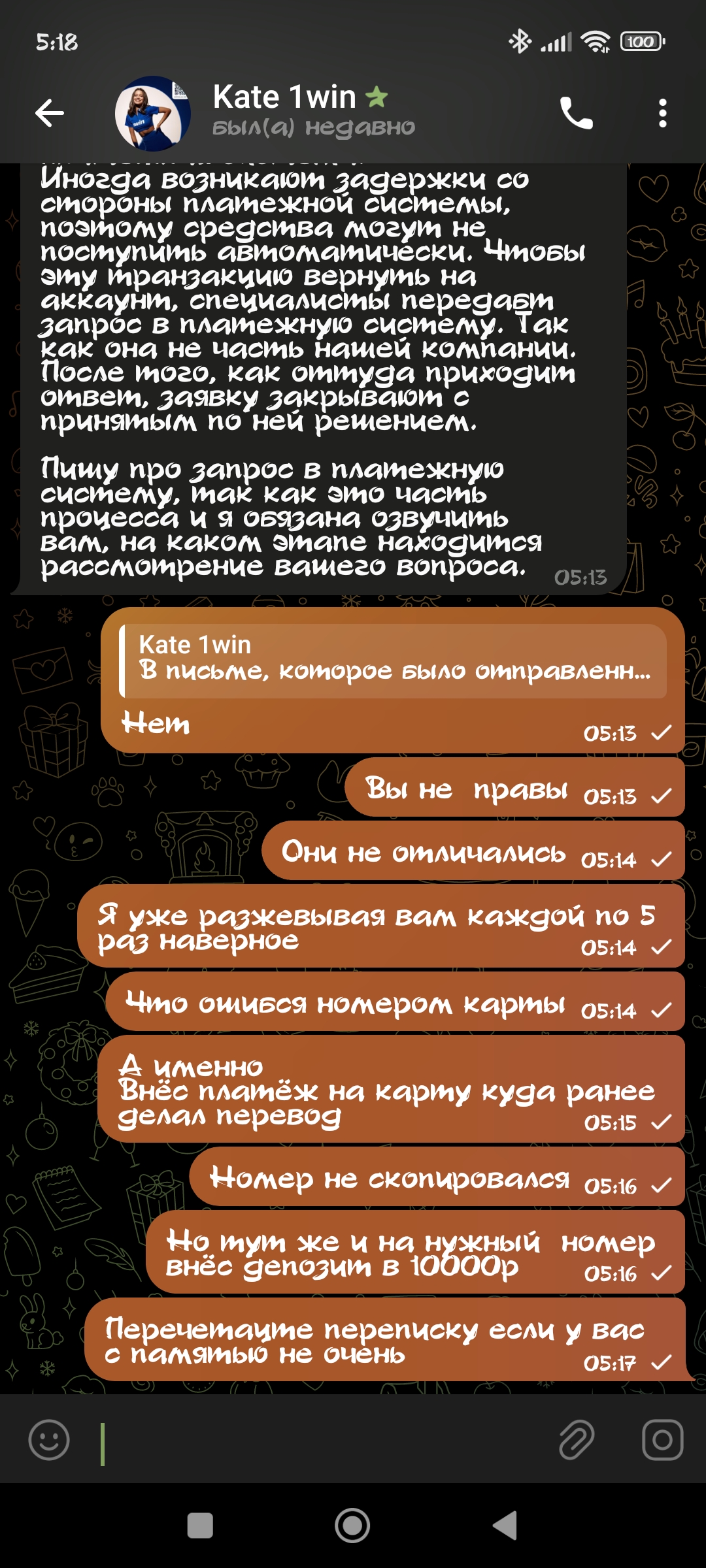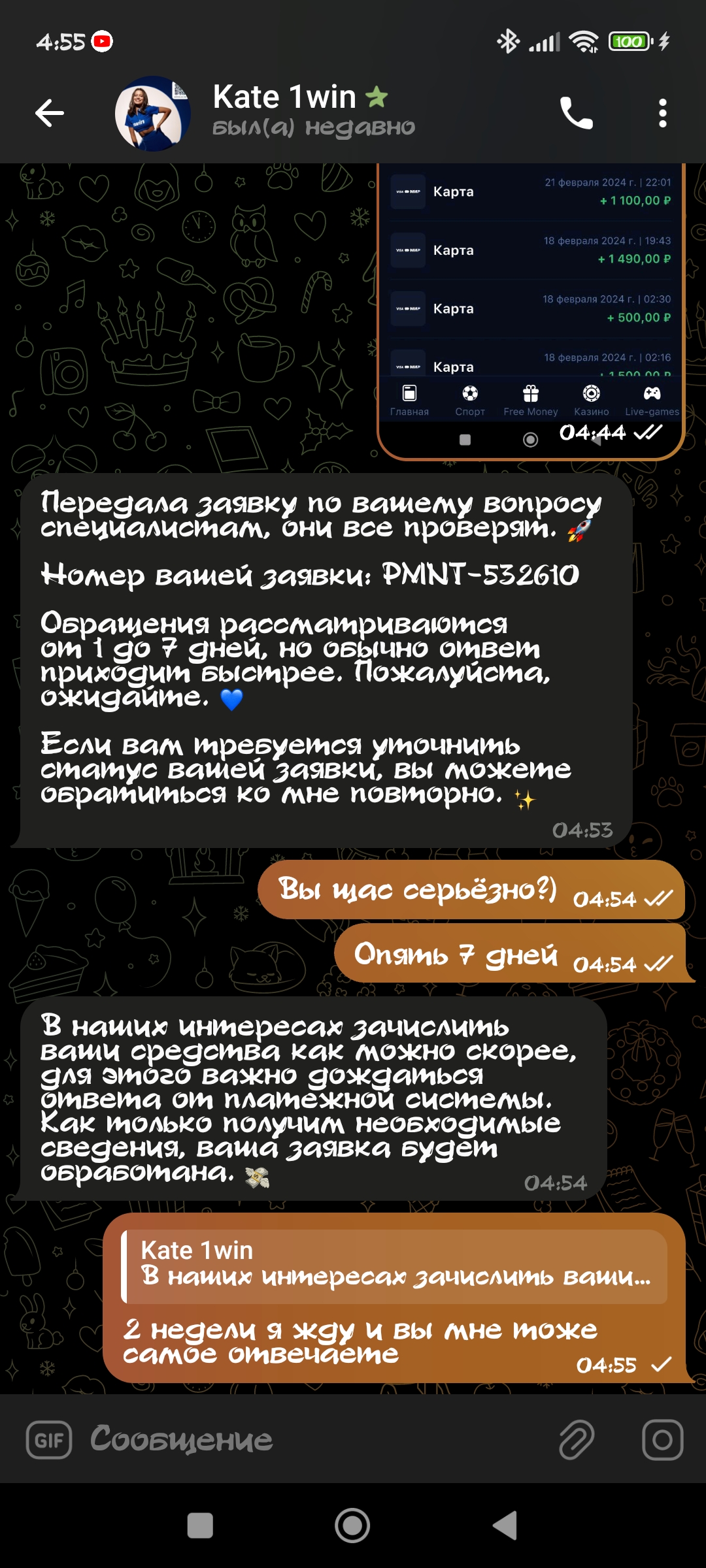 Здравствуйте выводил деньги с 1win в выводе написано что деньги зачислены но деньги на карту так и не пришли обращался в поддержку пишут ждать 7…