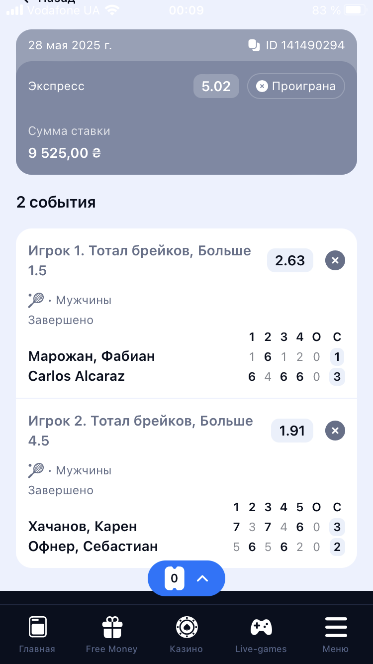 Здравствуйте, сделала ставку на турнир большого шлема id141490294, экспресс сыграл, но букмекер рассчитал ставку проигрышем. Я взяла Тотал брейков Марожана против Алькараса 1.5 больше, первом матче Марожан сделал 2 брейка: во втором сете первый и в четвертом сете второй Во-втором матче я взяла Тотал брейков Офнера против Хачанова 4.5 больше, он сделал 5 брейков: первый в первом сете, второй и третий брейк во втором сете, четвертый в четвертом и пятый брейк был сделан в первом гейме пятого сета. Имею статус вип игрока, что вип поддержка, что обычная говорят ждать, ответы по шаблону. Прошли уже почти сутки, не понимаю в чем заключается проблема, если на турнирах такого уровня информация обновляется сразу, есть во многих открытых источниках. Пожалуйста, рассмотрите мою проблему максимально быстро.