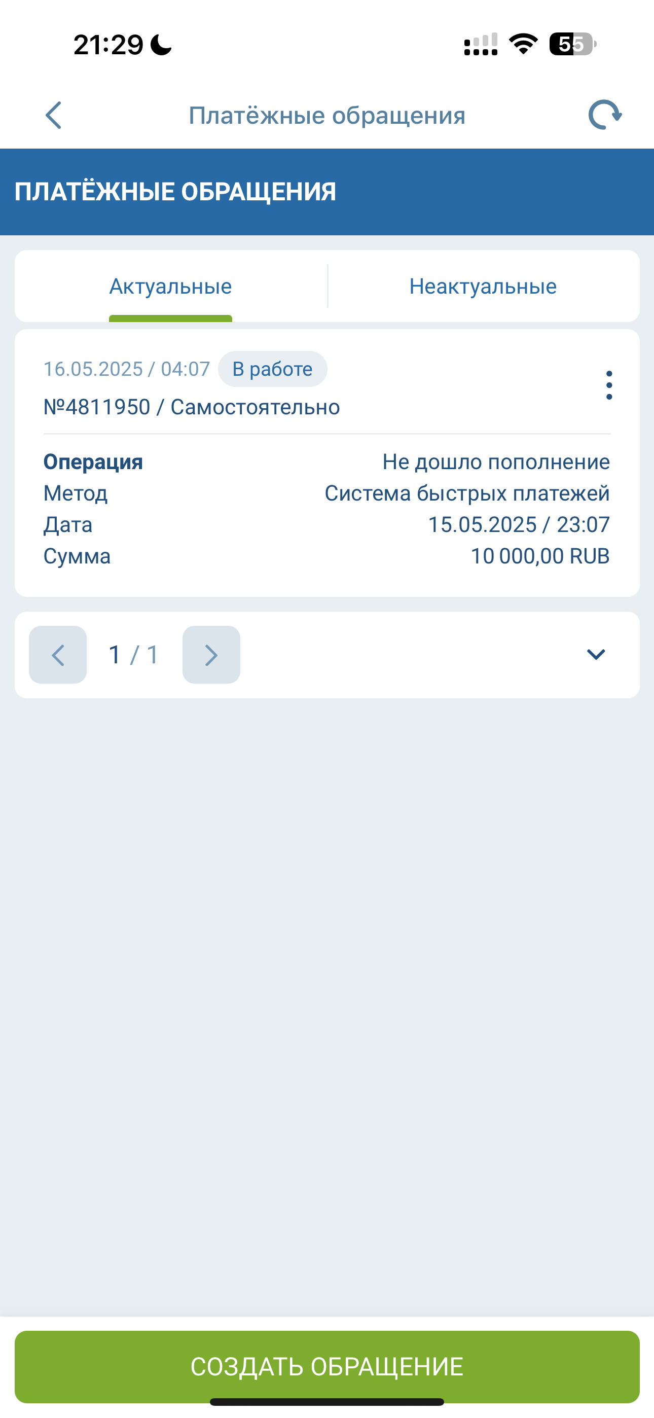 Добрый день, 15.05.2025 пополнял баланс на 10000₽ посредством перевода через СБП. Пополнение не дошло. Создал платежное обращение 16.05.2025, прикрепил чек и выписку, однако до сих пор в работе.