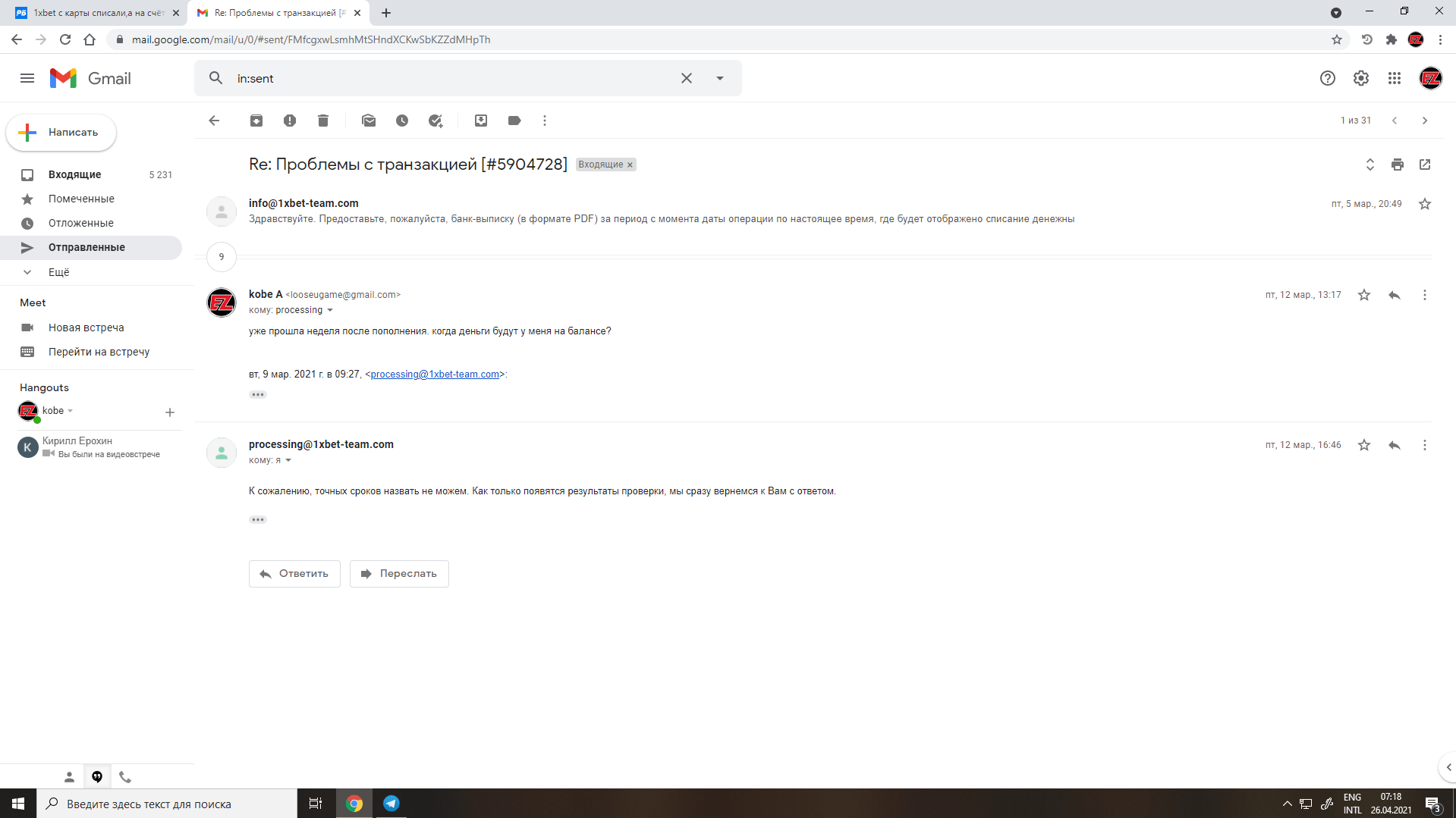 Здравствуйте , сделал вывод на сумму 10.000тр В 1xbet , 04.12.2025 , деньги так и не пришли уже 2 недели. Сделал обращения тоже в 04.12.2025…