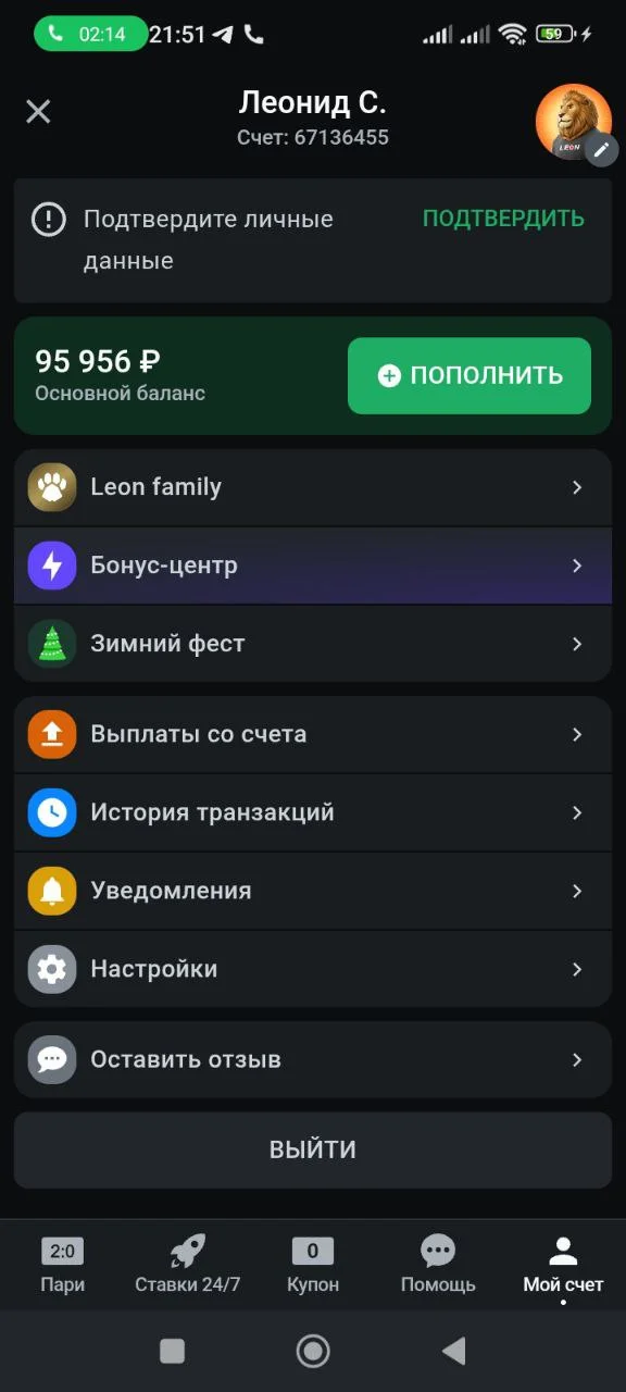 БК леон конфисковал мой выигрыш в размере 78300 рублей. Я прошел верификацию, крутил паспортом и лицом. 14 января прошёл видеоверификацию 20 минут, ответил на все вопросы, тк я хозяин аккаунта и ставил лично, в спорте разбираюсь очень хорошо. После видео мне написали, что я не прошёл верификацию и мои выигрыши просто украли. Дали вывести только депозит и заблокировали доступ в аккаунт. На все их вопросы ответил чётко, у меня большой стаж в играх. То, что я не прошёл вериф это просто смешно. Номер счёта 67136455