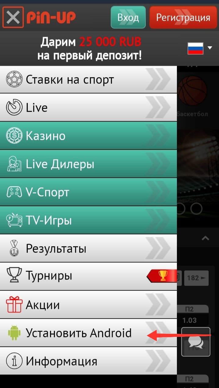 Для того, чтобы скачать Android приложение Pin-up, необходимо зайти на сайт букмекера и кликнуть на меню в левом верхнем углу, затем перейти в раздел «Установить Android», после чего отобразится пошаговая инструкция по установке.