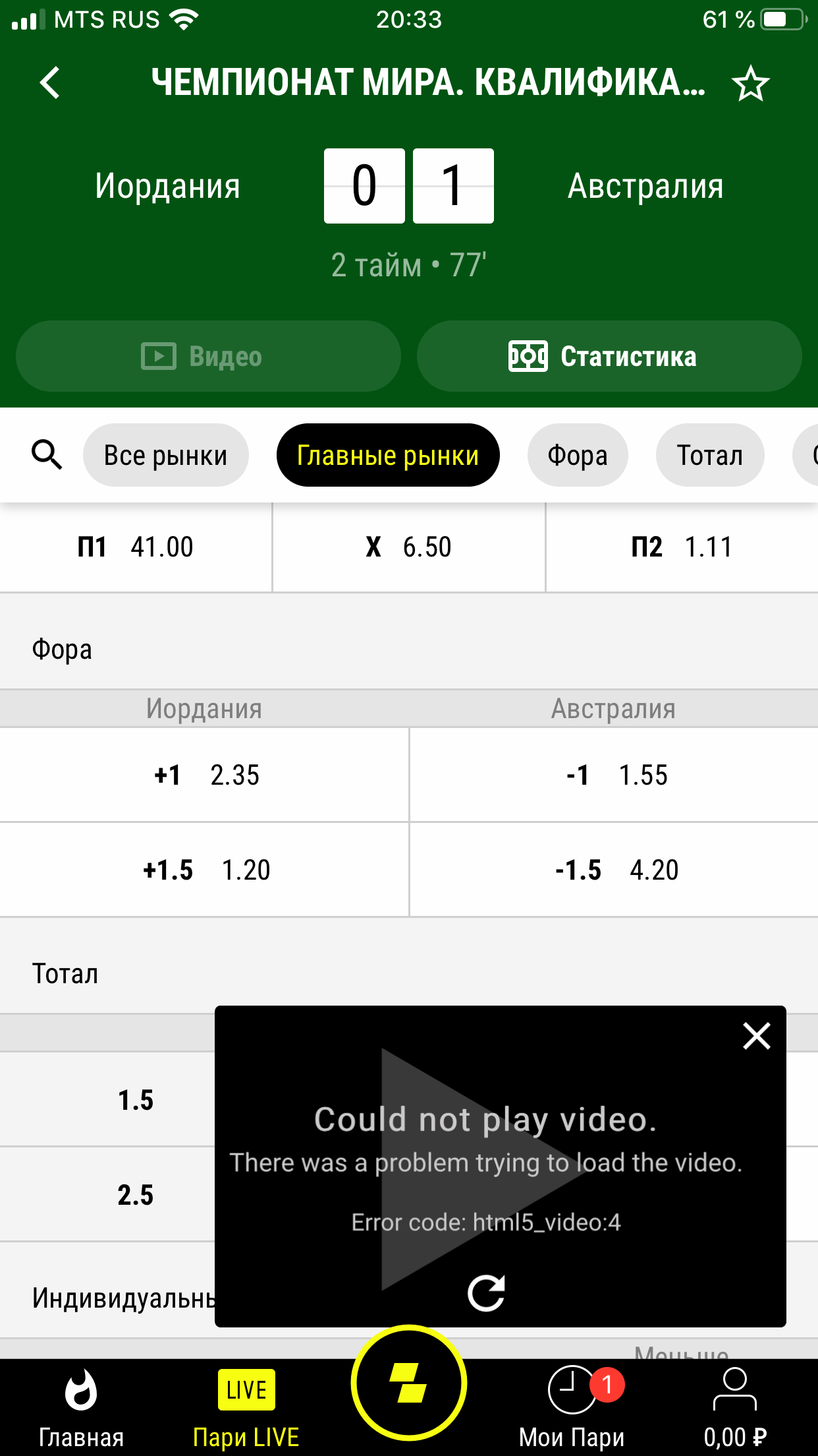 14.11.2019 решил я посмотреть трансляцию матча Йордания — Австралия. На Пари-Матче указано «трансляция доступна». Нажимаю на просмотр, надпись — «для просмотра трансляции сделайте ставку». Завел деньги, сделал (хотя пля для чего тогда трансляция уже нужна???), нажимаю опять на просмотр. И ОПС! «Could not play video»…