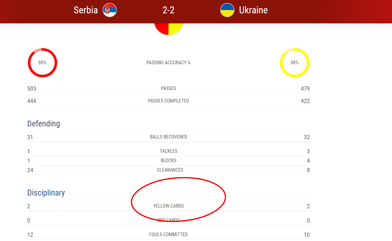 Здравствуйте! Подскажите пожалуйста, сколько желтых карточек было показано футболистам в матче евро 2020 Сербия Украина? На разных сайтах разная информация!