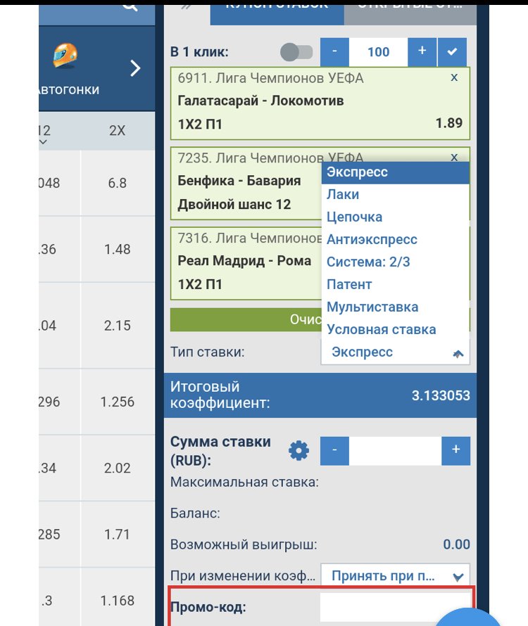 Есть возможность использовать промокод ещё, когда делаешь ставку.
