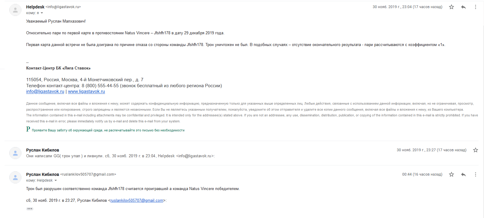 Ставила 3 ставки на матч Natus Vincere — Jfshfh178 (турнир WESG 2019). В связи с тем, что команда Jfshfh178 опоздала на 1 карту им засчитали поражение на 1 карте. Начали играть 2 карту, мои знакомые ставили на других букмекерских конторах и везде были ставки на 1 карту, т.к. это единственная карта, которая игралась. Коэффициенты изменялись в соответствии с происходящим в игре, мне удалось поставить на хороший коэффициент 2,63 и 4,36 (#644504950252, #855839102571, #959319180879). Но видите ли они написали что первая карта была техническое поражение, а потом выдвинули другую причину, что «трон» не упал. После этого я предоставила им запись игры, где отчетливо видно, что «трон» падает. Прошу разобраться с этим и рассчитать выигрыш!!!