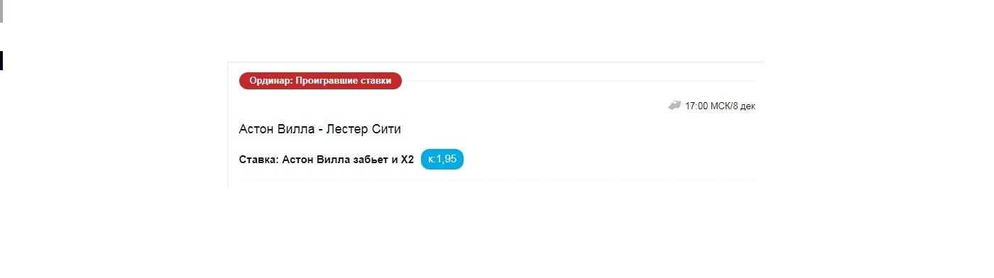Здравствуйте! Я делал прогноз на матч Астон Вилла — Лестер Сити. Прогноз был следующий «Астон Вилла забьет и X2». Результат встречи 1:4, но почему то посчитали, что ставка не прошла. Можно ли узнать почему?