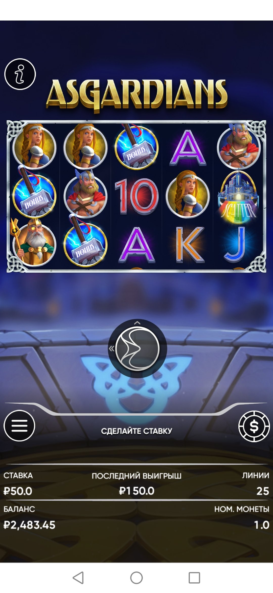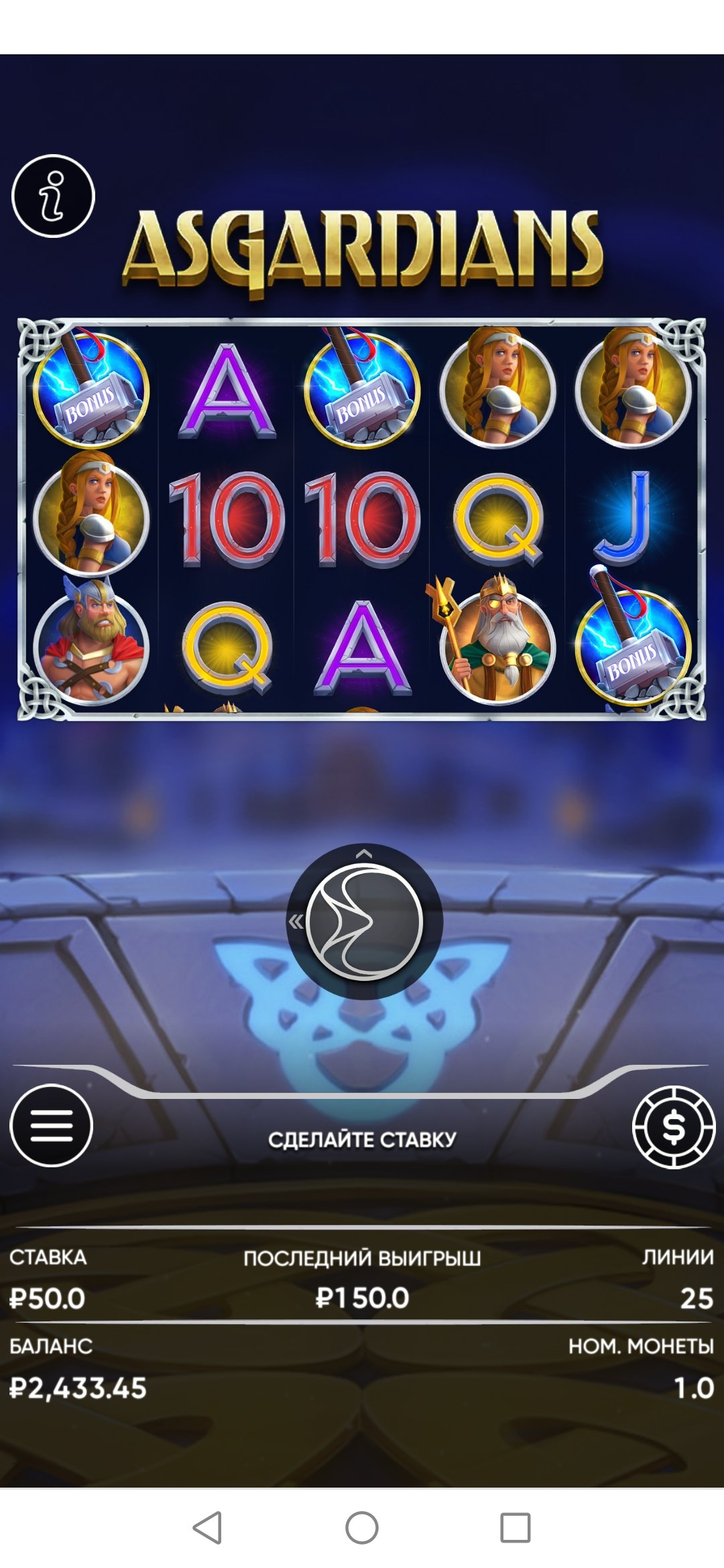 В слоте Asgardians бонусная игра запуская при выпадении специальных символов на одной из 25 линий, список которых Вы можете проверить в правилах слота, нажав значок «i» в правом верхнем углу.