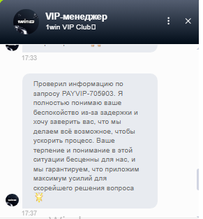 Вывод висит уже вторые сутки. В чате еще со вчера говорят что ускорили и ждите, но сколько ждать еще? Мне через 2 дня платить за квартиру, все деньги висят на выводе(30000р). Уже пришел сюда с надеждой что здесь представитель 1Win поможет! Id: 84151189 PAYVIP-705903