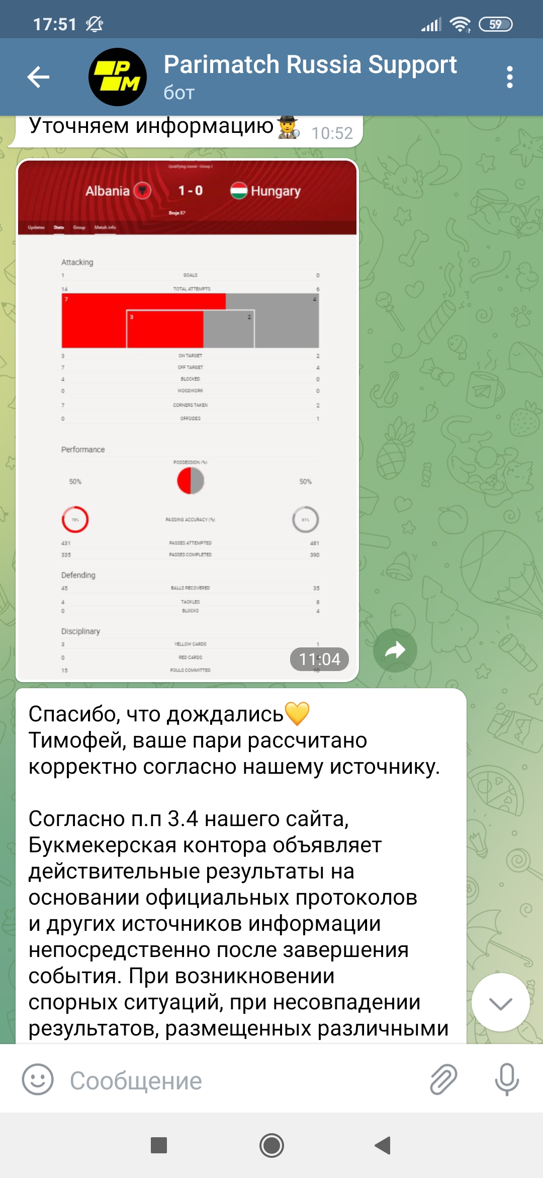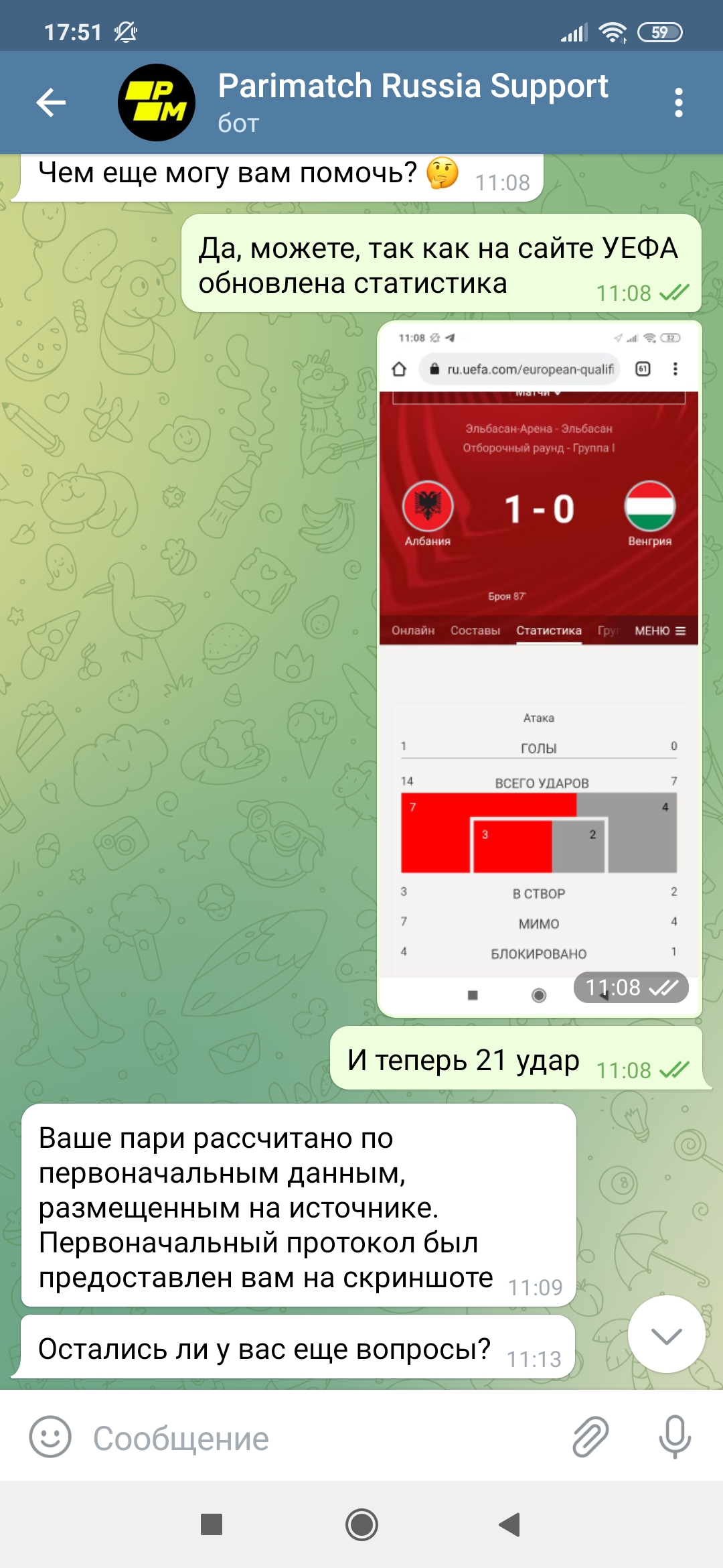 Здравствуйте, у меня возникла проблема с ПариМатч. Закончился матч между Албанией и Венгрией, на который у меня стояло то, что в матче будет 20.5 ударов по воротам. ФлэшСкор сразу после окончания матча показывал, что за весь матч было нанесено 20 ударов, я подумал, ну ладно, не зашло, но, проснувшись на следующее утро, я увидел, что они обновили статистику и уже было нанесено 21 удар. Я написал поддержке Пари, указав, как источник ФлэшСкор, они сразу оборвали мою претензию, указав на то, что они берут статистику с официального сайта УЕФА, я зашел на этот сайт и увидел, что там тоже 21 удар, написав им об этом, они сказали, что они рассчитывают ставку по первому протоколу, ссылаясь на пункт правил 3.4 «Тимофей, по пункту правил: 3.4. Букмекерская контора объявляет действительные результаты на основании официальных протоколов и других источников информации непосредственно после завершения события. При возникновении спорных ситуаций, при несовпадении результатов, размещенных различными источниками, при их очевидных ошибках, окончательное решение об определении результатов для расчета выплат принимает букмекерская контора.» Я им ответил: -«Где написано то, о чем вы говорите? В пункте 3.4 не написано, что пари рассчитывается по первоначальному протоколу. Пари рассчитывается на основании официального протокола, официальный же протокол говорит о том, что в матче был 21 удар. Я не обязан заходить в архив сайта УЕФА и проверять, на самом ли деле было 14:6 удара, а не 14:7 непосредственно после завершения события» Также, стоит отметить, что они мне отправили скрин сайта УЕФА, на котором отображается 20 ударов. Скрины предоставить переписки могу, так вот, правы ли они?