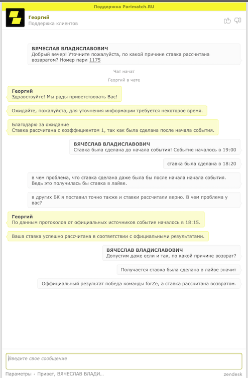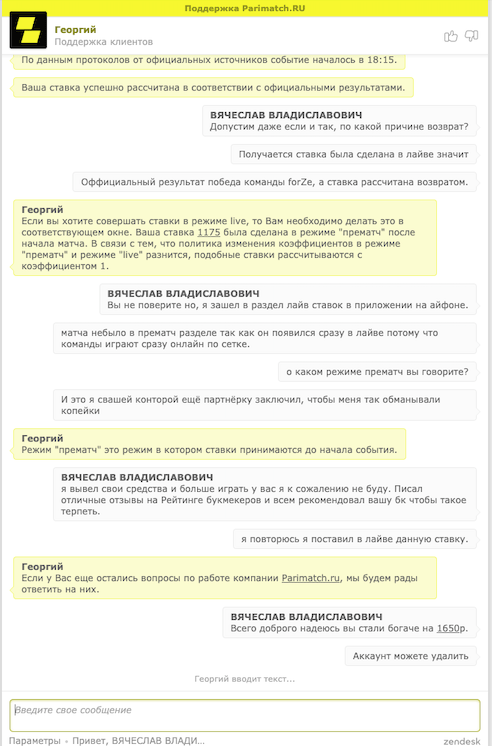 Ну что ж… Пришло время и мне написать негативный отзыв о букмекерской конторе. К сожалению это ПариМатч… А речь то всего лишь о 1650р… Но дело не в сумме, а в принципе. Поставил я тут 5000р на киберспортивное событие Winstrike против forZe, на победу forZe с коэффициентом 1.33, сумма выигрыша 6650р. Поставил я в режиме ЛАЙВ, так как это онлайн турнир и команды двигались по сетке и события появлялись во всех БК сразу в разделе ЛАЙВ. Ставка разумеется сыграла но, БК рассчитала мне ее возвратом. Я сразу же написал в тех поддержку, что мне было сказано, что событие началось в 18:15 по их оффициальным источникам. Я говорю «Хорошо, но ставка моя сделана в 18:20 в разделе ЛАЙВ через приложение на айфоне, по какой причине возврат?», мне отвечают, что ставка была сделана в режиме ПРЕМАТЧ. Я очень удивлен, что спустя 5 минут после начала матча в приложении на айфоне в разделе ЛАЙВ можно поставить ставку в режиме ПРЕМАТЧ. Естественно ставку мне рассчитали верно и пожелали всего доброго. Скриншоты ставки и переписки с неродивым «роботом» Георгием есть. Данный вопрос как-то возможно решить или же такие вопросы не решаются. Обидно за тот факт, что ставил 5000р собственных денег и переживал за ставку больше 2.5 часов, а в итоге такое свинское отношение со стороны БК… И это с учетом того, что я являюсь партнером данной БК и всем ее рекомендовал.