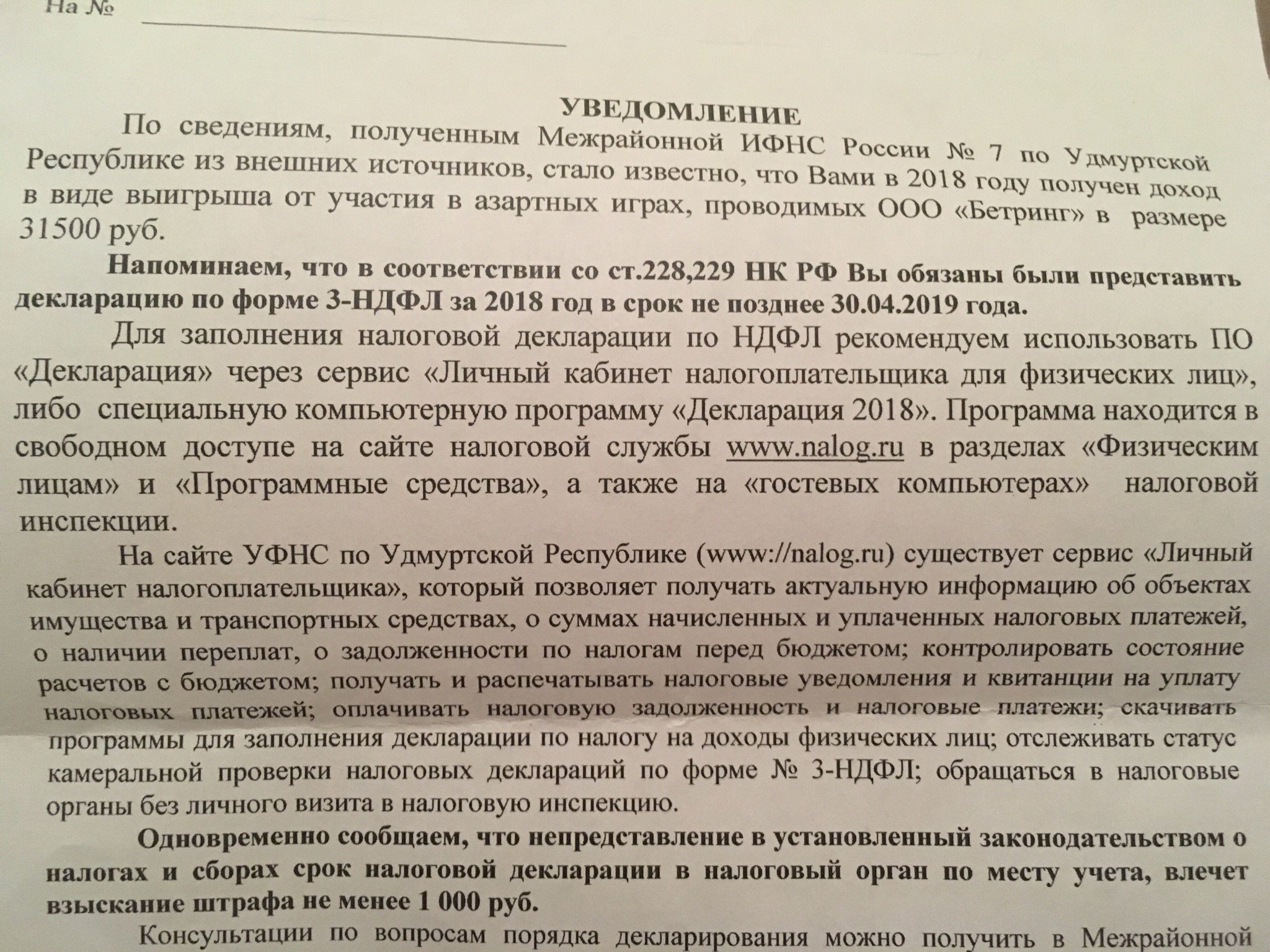 Тоже пришло уведомление из налоговой на сумму выигрыша 31500.Хотя я за весь 2018 год внёс 500 рублей проиграл их и больше не ставил.С отделения почты письмо не забирают,на электронную почту не отвечают.Мошенники одним словом.