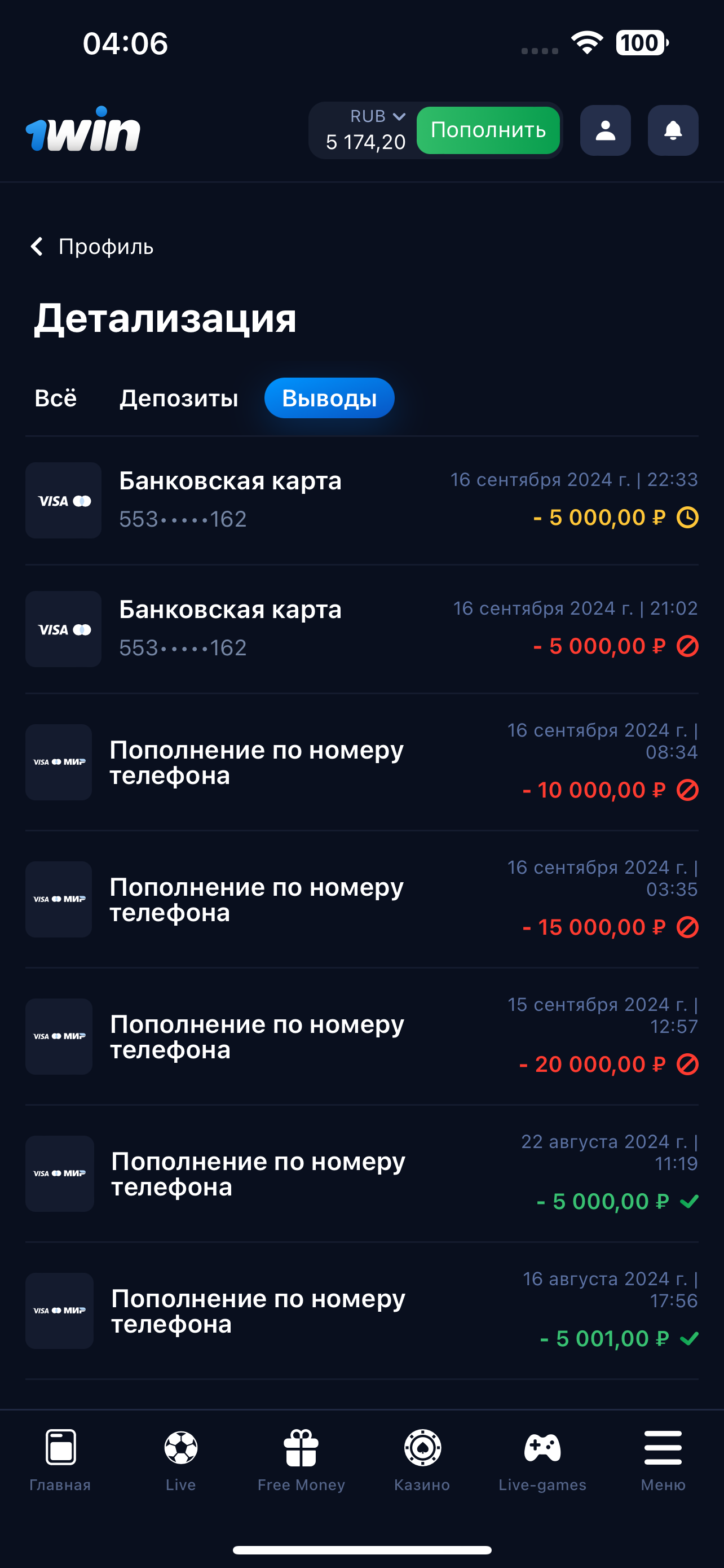 Здравствуйте выводил деньги с 1win в выводе написано что деньги зачислены но деньги на карту так и не пришли обращался в поддержку пишут ждать 7…