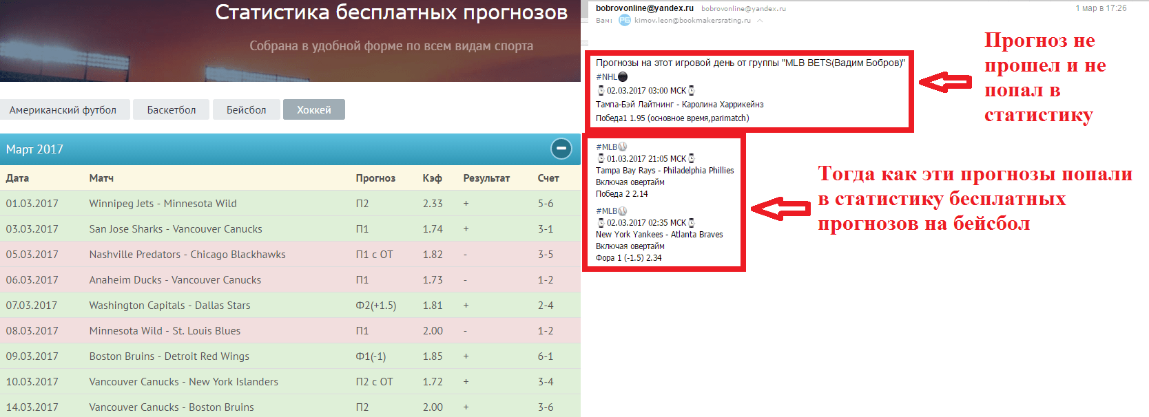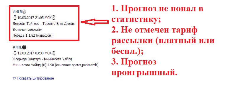 Добрый день. Даже если я и ошибся в одном эпизоде, это не отменяет других нарушений. Вы отправляете нам несколько прогнозы в одном письме, не отмечая их тариф. Выигрышные попадают в статистику, а проигрышные исчезают.На сайте и в группе должна быть ВСЯ полная статистика проекта, вне зависимости от того, Ваши прогнозы это или прогнозы вашего «прогнозиста». Тогда почему в письме Вы не отмечали «прогнозы вашего прогнозиста»?Вывод один: ваша рассылка не соответствует вашей статистике. Такого каппера мы не можем рекомендовать пользователям