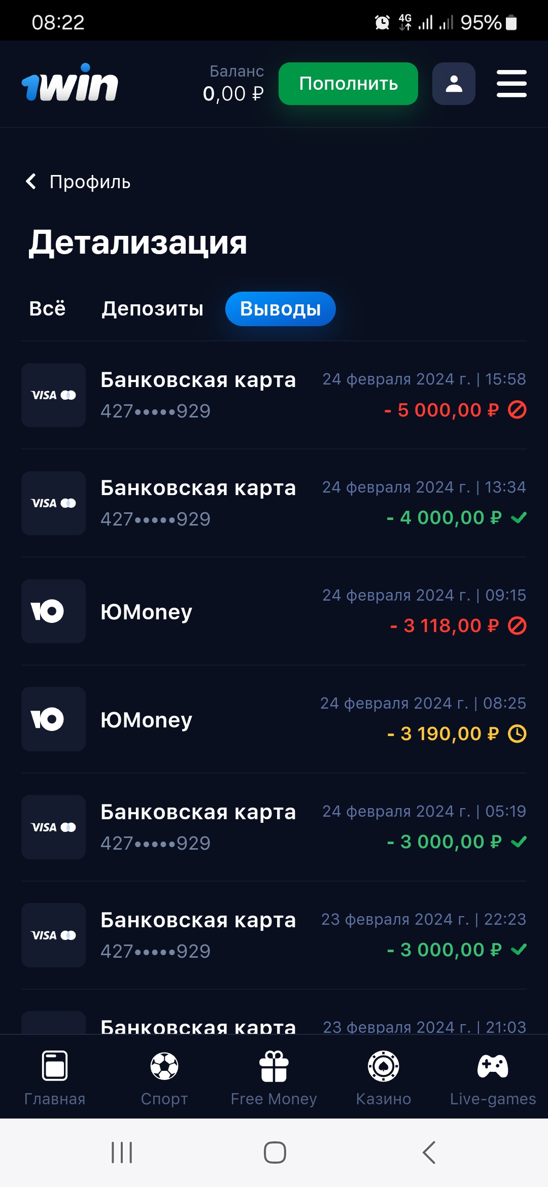 Здравствуйте выводил деньги с 1win в выводе написано что деньги зачислены но деньги на карту так и не пришли обращался в поддержку пишут ждать 7…