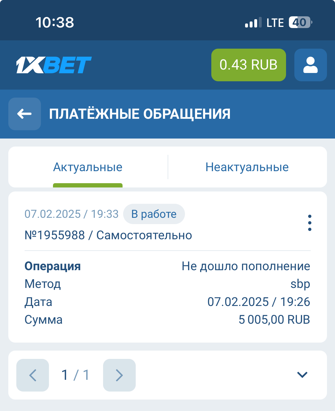 Добрый день. Видел здесь представителя 1хбет, может и мне помогут с возвратом недошедшего пополнения, уже нет надежды другой особо. Пополнение 07.02.2025 — почти 4 месяца
