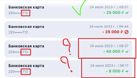 Выводил 24.07.2023 денежные средства тремя разными платежами. Все платежи были на одни и те же реквизиты (ничего я перепутать не мог, так как номер карты вставлял скопированный, а не печатал вручную).