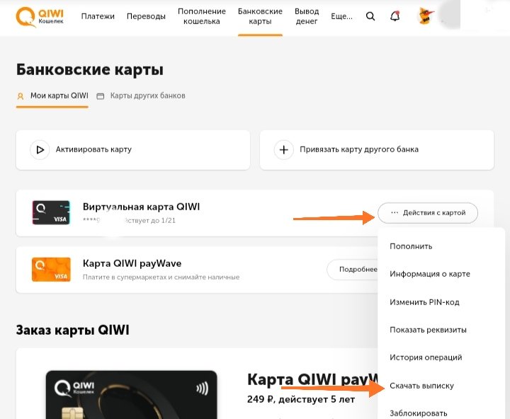 Если у вас есть QIWI Карта, скачать выписку по карте вы сможете в разделе «Банковские карты».