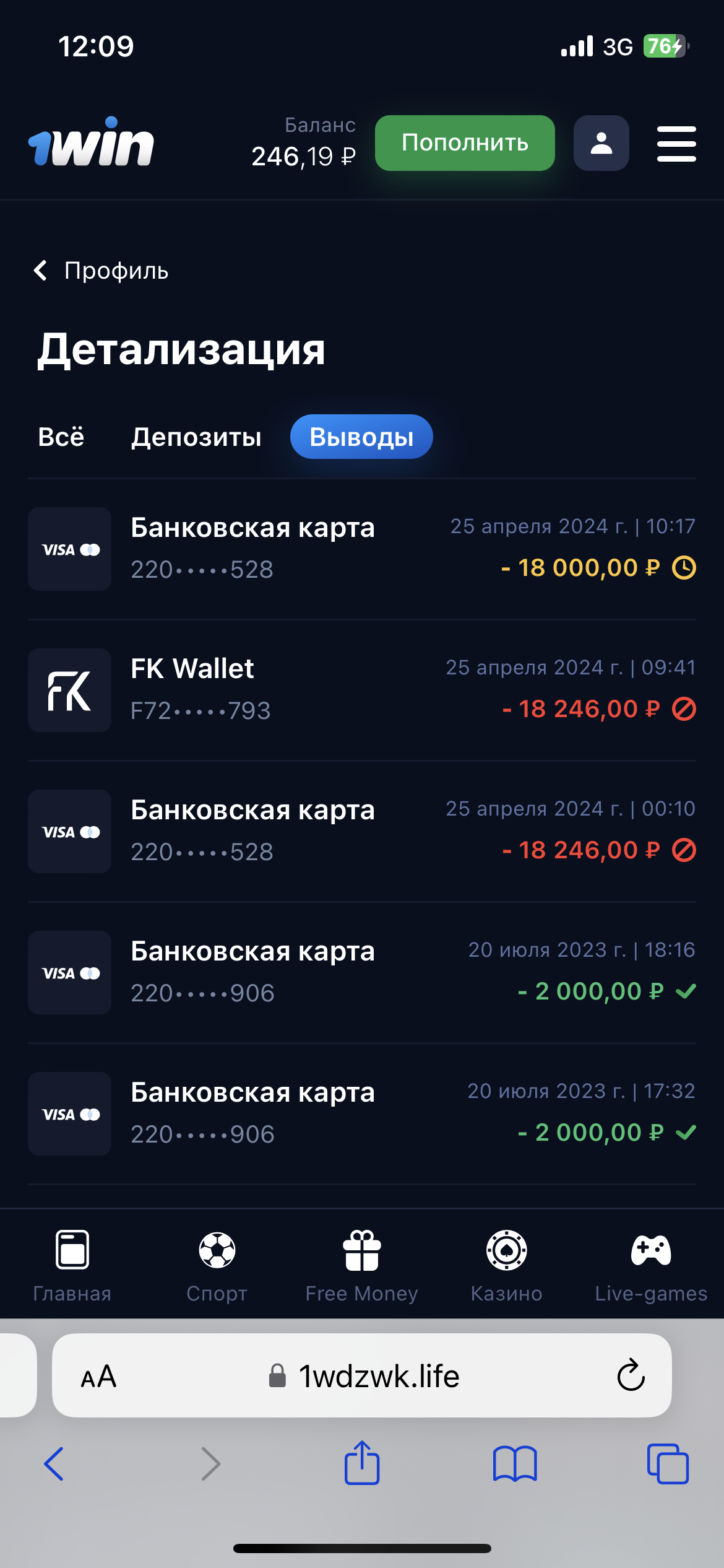 Здравствуйте выводил деньги с 1win в выводе написано что деньги зачислены но деньги на карту так и не пришли обращался в поддержку пишут ждать 7…