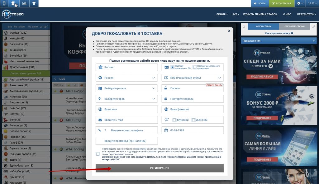 Как зарегистрироваться на сайте 1xstavka.ru?