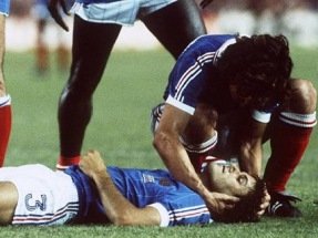 Дело было в полуфинальном матче испанского ЧМ-1982 года между сборными Франции и ФРГ. Игрок французской команды Патрик Баттистон, получив пас на ход от Мишеля Платини, выходил к воротам немцев и вполне мог забить гол, но выскочивший из ворот голкипер Харальд Шумахер подставил корпус так, что Баттистон рухнул на поле без сознания. Его пришлось уносить на носилках. К счастью для француза, в этом страшном эпизоде самое большое, что он потерял, были 3 зуба.