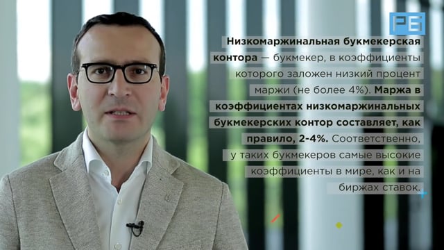 Низкомаржинальная букмекерская контора - букмекер, в коэффициенты которого заложен низкий процент маржи (не более 4%). Маржа в коэффициентах низкомаржинальных букмекерских контор составляет, как правило, 2-4%. Соответственно у таких букмекеров самые высокие коэффициенты в мире, как и на биржах ставок.